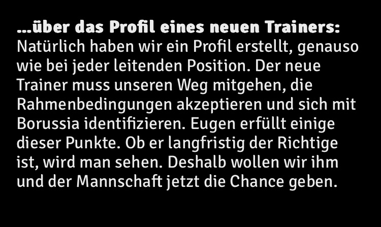 Der Punkt mit dem Anforderungsprofil an den Trainer ist aber noch banaler. Wenn „unseren Weg mitgehen“, „die Rahmenbedingungen akzeptieren“ und „sich mit Borussia identifizieren“ die wichtigsten Punkte sind und Polanski einige dieser Punkte erfüllt, möchte ich sehr gerne mal wissen, welche dieser 3 Punkte er nicht erfüllt??
