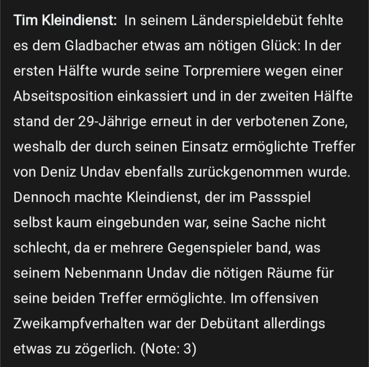 Tim Kleindienst: Der zweite Neuling in der deutschen Nationalmannschaft durfte direkt über 90 Minuten ran. Zwar blieb der Gladbacher Stürmer ohne gültiges Tor, auf sich aufmerksam machte er dennoch. So näherte er sich nach acht Minuten erstmals dem Tor, lief die gegnerische Defensive immer wieder an und wirbelte sich durch. Mit Abseits hat er mehrmals eine Bekanntschaft gemacht (wie in der 34. Minute). Solides Debüt. Note: 3