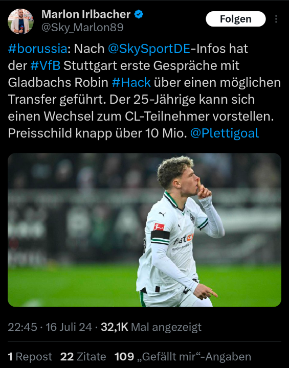 Stuttgart-Gerüchte sind halt aktuell in aller Munde. Bei den ganzen Abgängen müssen irgendwann ja auch Neuzugänge kommen und dann sucht man sich halt drei oder vier Spieler pro Verein aus und schreibt ein "ist möglicherweise interessiert an"-Gerücht und nennt eine Summe die im Bereich oder knapp über dem virtuellen Wert von Transfermarkt liegt. Schon ist ein Gerücht da und da Stuttgart gerüchtenzufolge an der halben Liga interessiert ist, findet sich bei 100 Gerüchten irgendwann auch mal ein Treffer. Unwahrscheinlich, dass ausgerechnet bei Hack etwas dran sein soll. Zumal man aktuell nur von Summen hört, die bei alten Fußballspielen mit "Der Manager nimmt das Telefongespräch an und beendet es mit einem höflichen Lachen" betitelt wurden.
